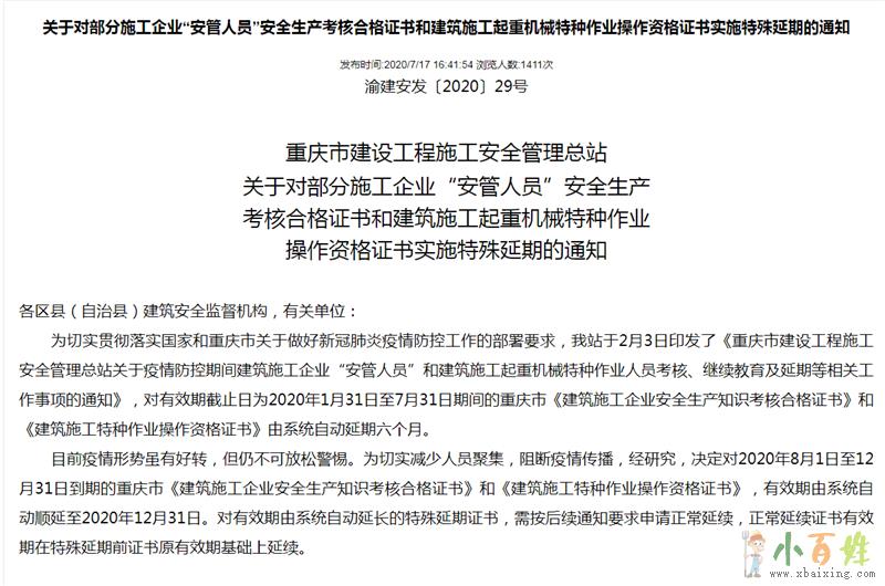 今年因为全球特殊时期,为了大家的安全着想,切断一切密集聚集可能性,所以暂停了关于塔吊升降机等特种作业的新考及年审的相关考试,同时,考虑到不影响大家正常上班的情况,所有今年到期的证,有效期全部顺延至年底,到时再根据实际情况进行安排,所以大家不用着急,今年到期的证书都是有效的,可以正常使用的,不用着急报名,如果还有什么不懂的,可以来电咨询,就不要再到学校白跑一趟了小 百 姓 网。